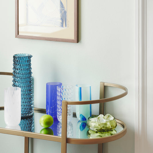 Se hele Kodanska Flow Kollektionen her. Vores ønske er, at Flow skaber glæde og bliver en æstetisk, farverig og kunstnerisk tilføjelse til boligen. Farverne er valgt ud fra en legende tilgang til indretning med brug af knust glas og stofrester, der i processen udvikler sig til striber, prikker eller et grafisk mønster. Her finder du både Flow vaser, karafler og vandglas.